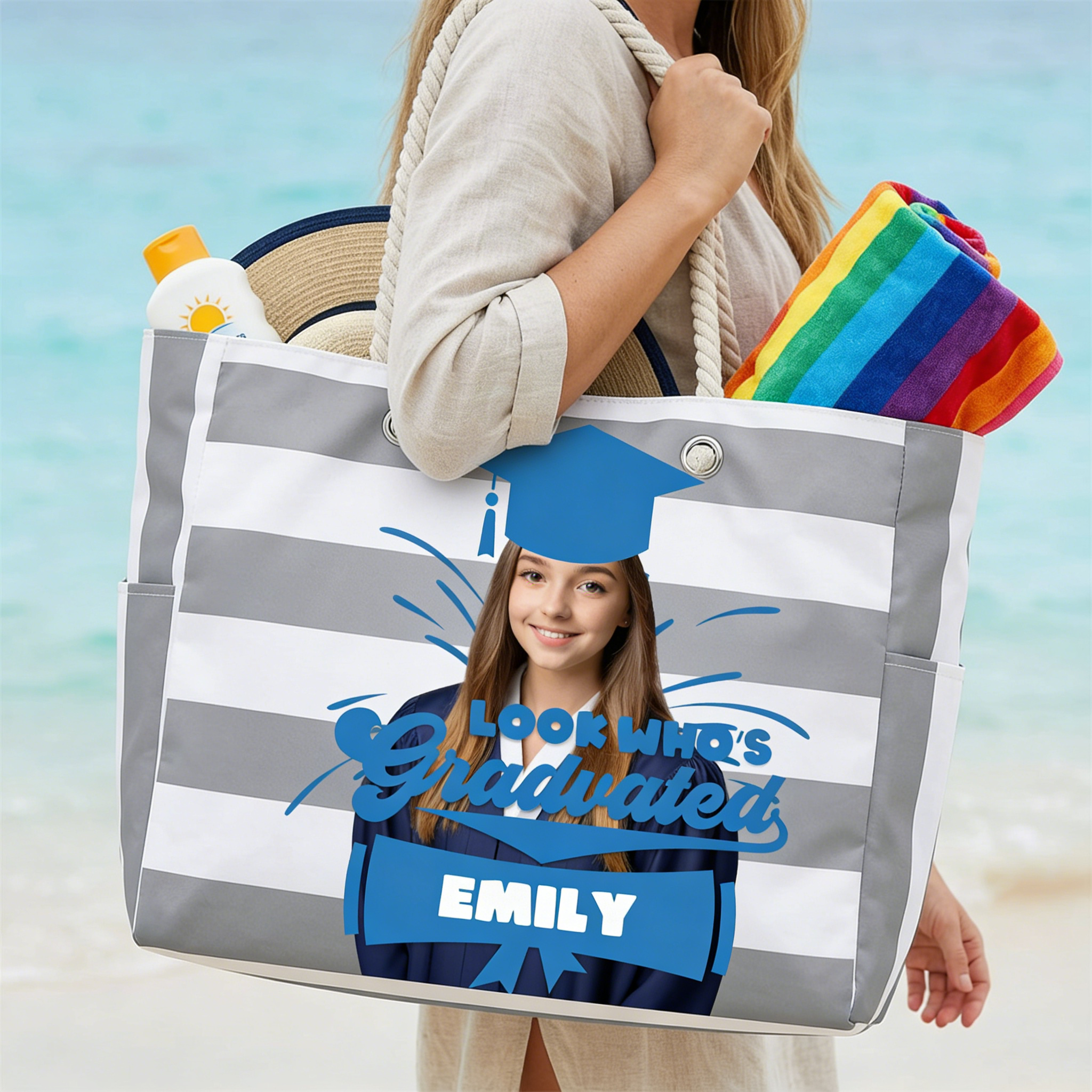 🎓 Graduation Season Custom Photo Beach Bag - Large Capacity & Personalized Design