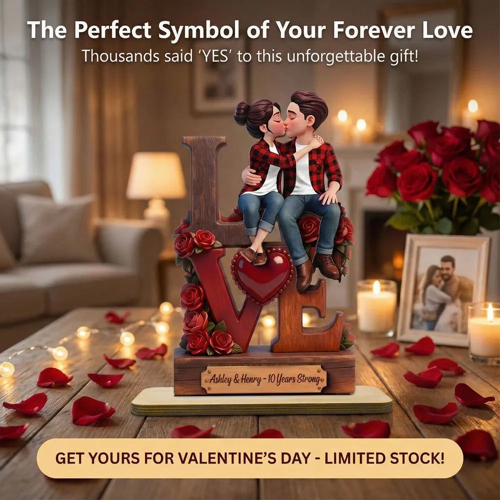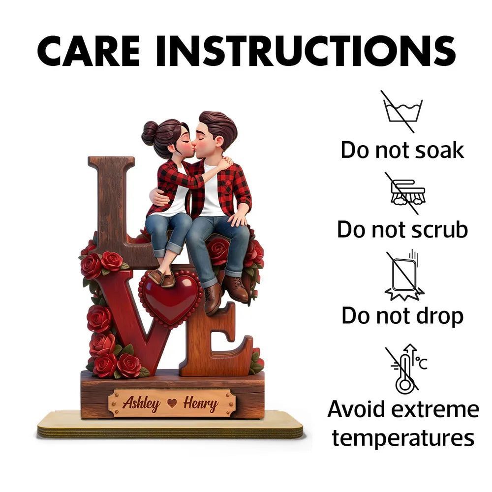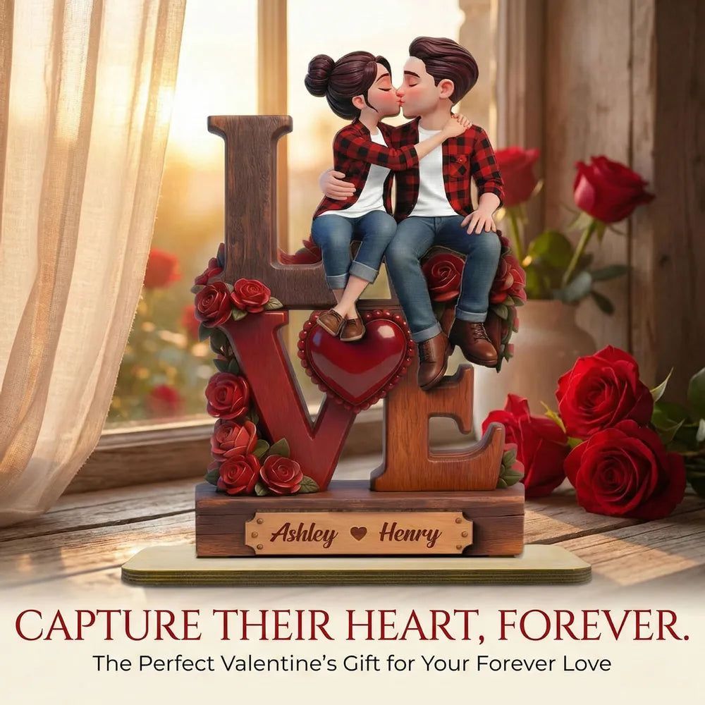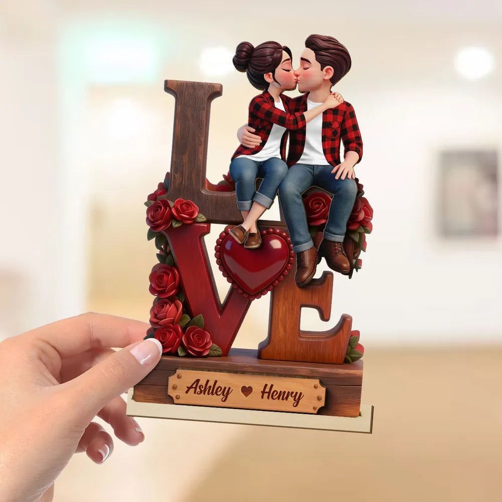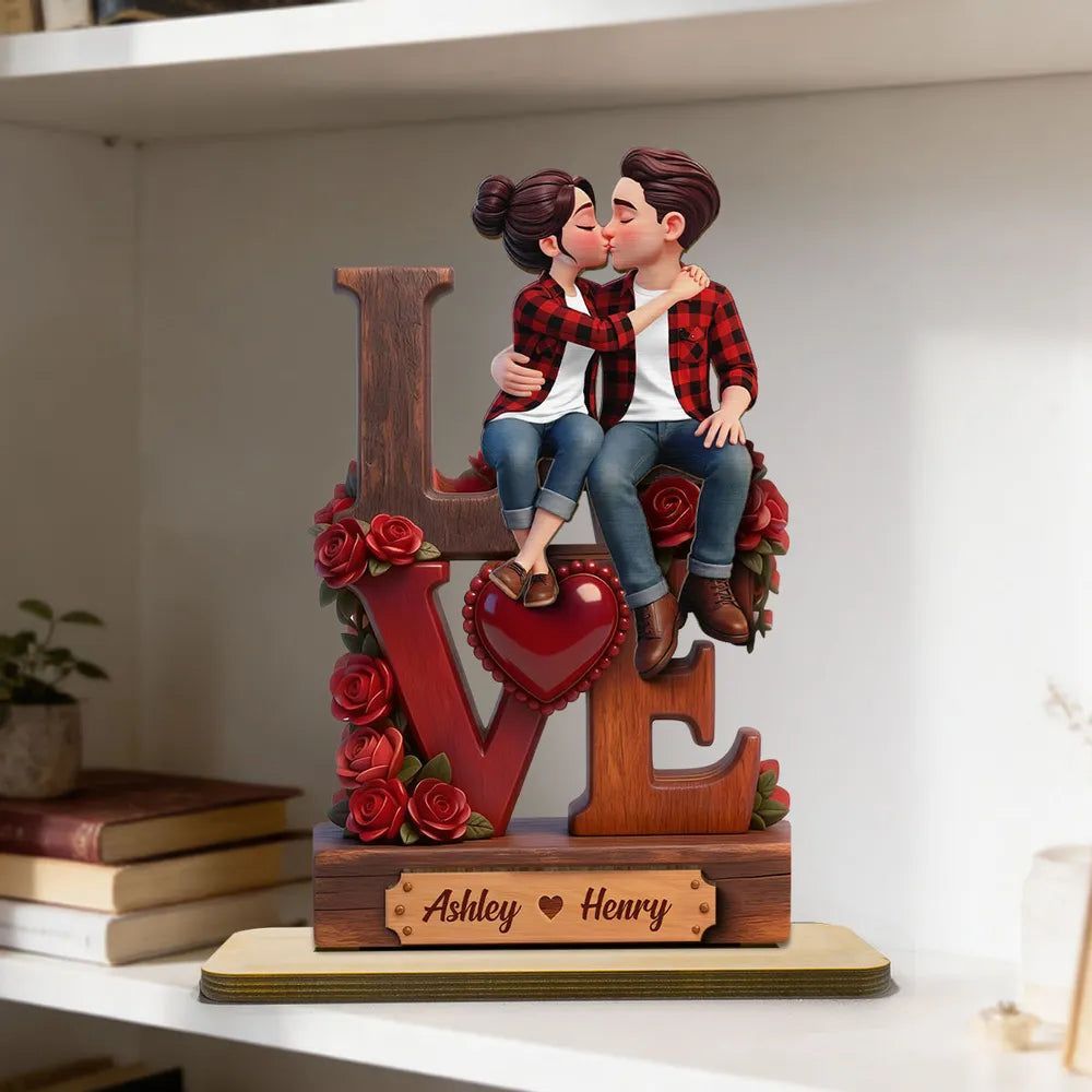 2-Layer Wooden Plaque with Kissing Couple on LOVE and Red Roses - Personalized Keepsake for Anniversary or Valentine's Gift